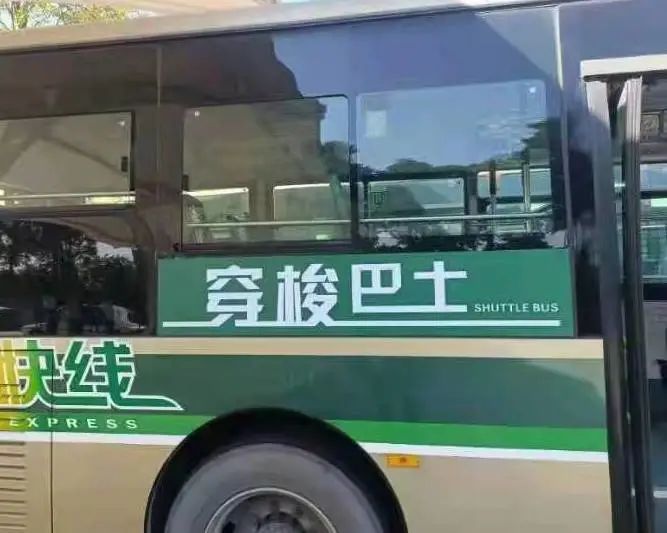 车身两侧贴有“穿梭巴士”字样,方便乘客寻找辨认。