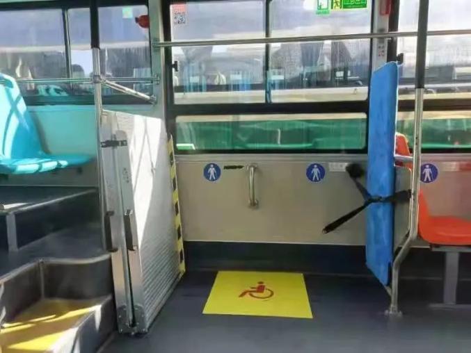 车厢中部正对着后门处增设轮椅停放区域,并安装了安全带和软垫,提高特殊人群乘坐的安全性和舒适性。