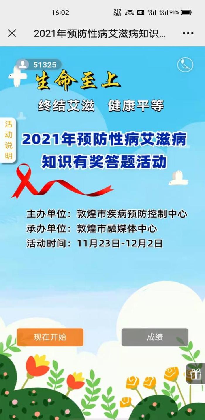 11月23日起,全民线上微信答题抢红包活动的上线,拉开了敦煌市世界艾滋病日主题宣传的序幕。微信红包通过普及艾滋病防治常识,倡导全民知艾防艾、消除歧视、健康平等,呼吁居民科学防艾、主动检测,共同为终结艾滋筑起健康屏障。截止12月2日12时活动结束,累计参与答题抢红包51273人次,访问人数111859人次。
