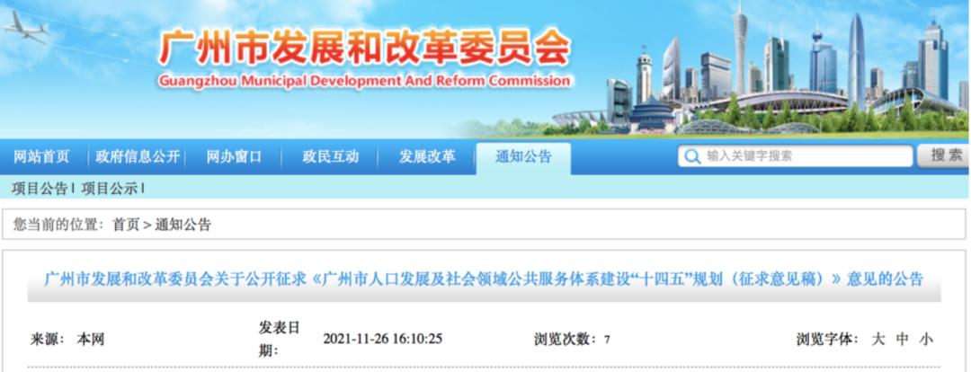 11月26日,广州市发改委发布《广州市人口发展及社会领域公共服务体系建设“十四五”规划(征求意见稿)》。