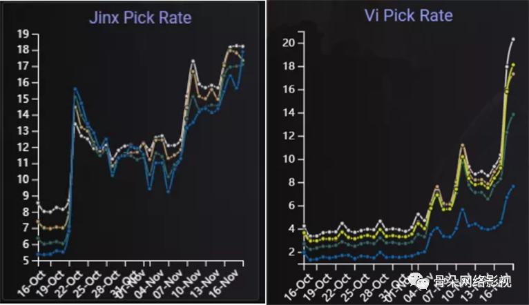 据网站lolalytics统计,自《双城之战》动画剧集开播以来,其主要出场角色在游戏中的登场率出现了显著提升。以动漫两位女主角金克丝和蔚为例:动漫上线前一个月,金克丝登场率仅为7%,而开播后仅十日便升至17%,仅次于原本使用率就颇高的英雄凯特琳。对比“联盟亲女儿金克丝”,蔚的“成长”也同样惊人,开播前蔚的全分段出场率不足3%,半个月后就攀升到18.15%,超过野区常用英雄盲僧成为人气打野选手。