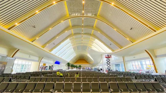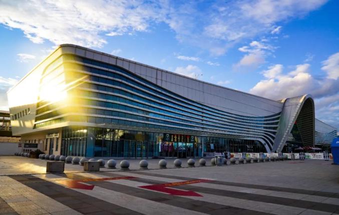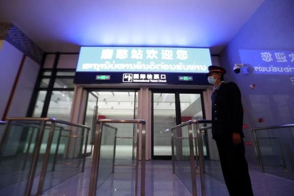 列车停靠磨憨站后,旅客在此办理入境手续。