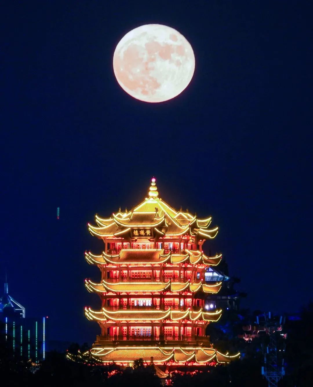 9月21日晚,中秋圆月高悬在武汉黄鹤楼上空,皎洁明亮。(湖北日报全媒记者 柯皓 实习生 刘航 摄)