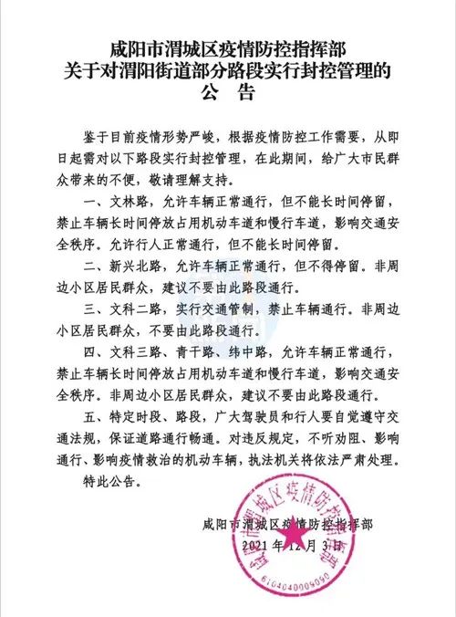 12月3日,咸阳市渭城区疫情防控指挥部发布消息,鉴于目前防控形势严峻,根据疫情防控工作需要,从即日起需对渭城区渭阳街道部分路段实行封控管理,在此期间,给广大市民群众带来的不便,敬请理解支持。
