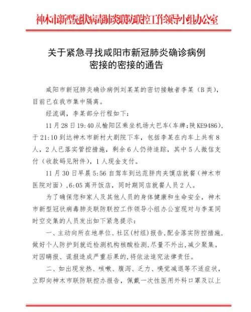 11月28日19:40从榆阳区乘坐机场大巴车(车牌:陕KE9486)。于21:10到达神木市新村大剧院下车,包括李某在内车上共有8人,2人已落实管控措施,剩余6人仍待追踪,其中5人微信支付,1人现金支付。