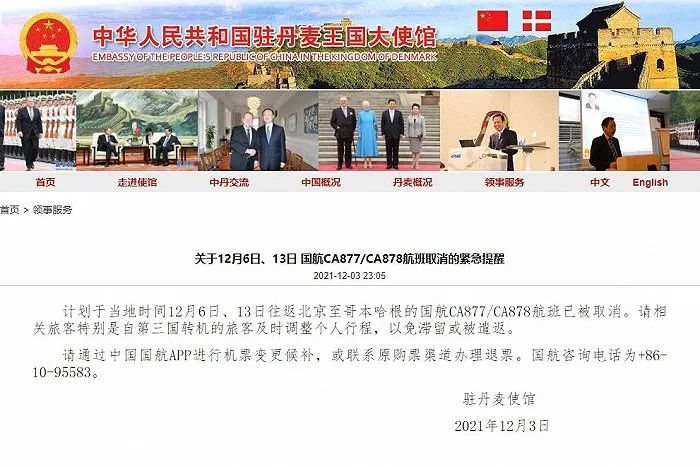 中国驻丹麦大使馆12月3日发布紧急提醒称,计划于当地时间12月6日、13日往返北京至哥本哈根的国航CA877/CA878航班已被取消。请相关旅客特别是自第三国转机的旅客及时调整个人行程,以免滞留或被遣返。