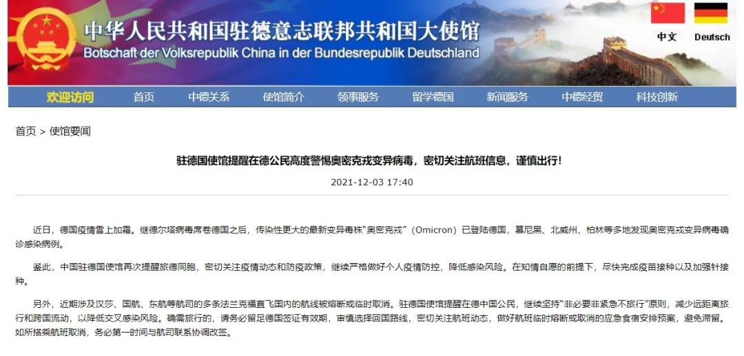 鉴此,中国驻德国使馆再次提醒旅德同胞,密切关注疫情动态和防疫政策,继续严格做好个人疫情防控,降低感染风险。在知情自愿的前提下,尽快完成疫苗接种以及加强针接种。