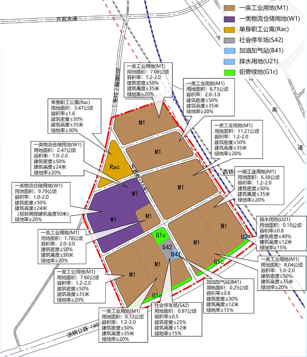 1、土地利用规划。总用地面积90.85 公顷,主要为产业用地,其中一类工业用地55.54公顷,一类物流仓储用地12.26公顷。
