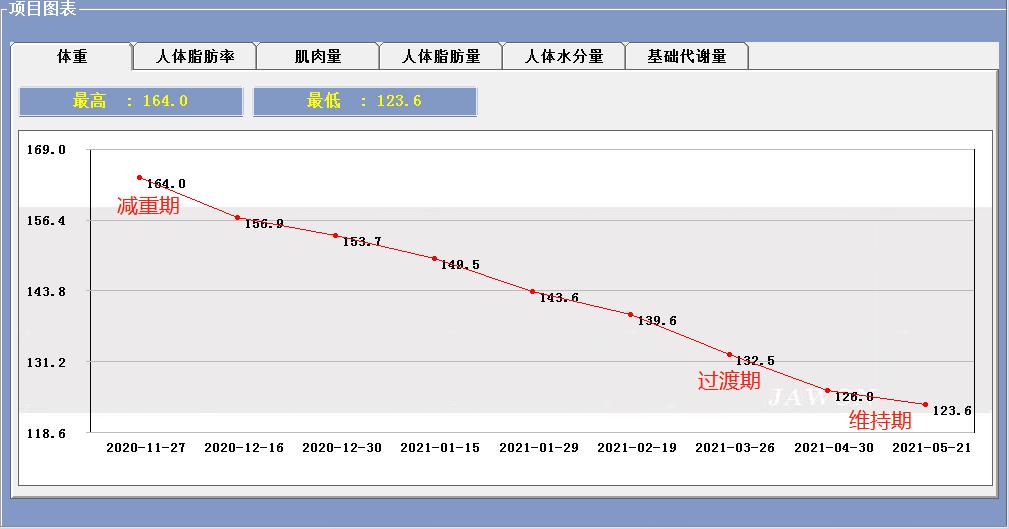 通过半年的努力,小何的体重由164kg下降至123.6kg,总下降80.8斤。