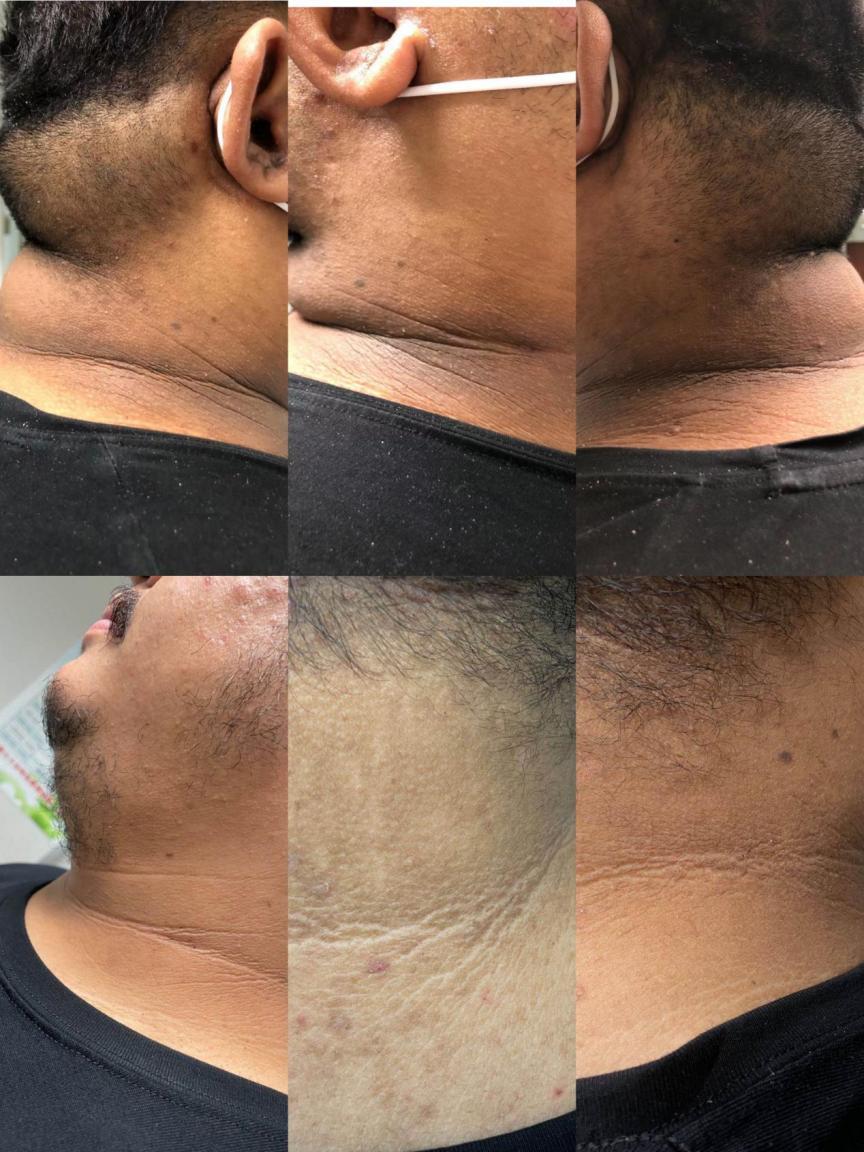 陈宏教授解释,肥胖会让体内代谢出现异常和紊乱,胰岛素水平增高,促进角化细胞和成纤维细胞生长,导致皮肤过度角化,同时局部肤色加深,出现黑棘皮症的特征性标志——皮肤表面出现天鹅绒样的色素沉着斑块,局部皮肤增厚,摸起来有颗粒感。