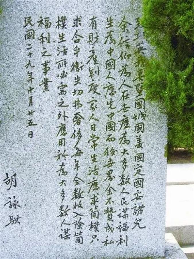 在遗嘱中,胡詠骐写道:“余信仰为人在世应为大多数人民谋福利,生为中国人应先中国而后世界。”谆谆教诲,切切言辞,以托后人。