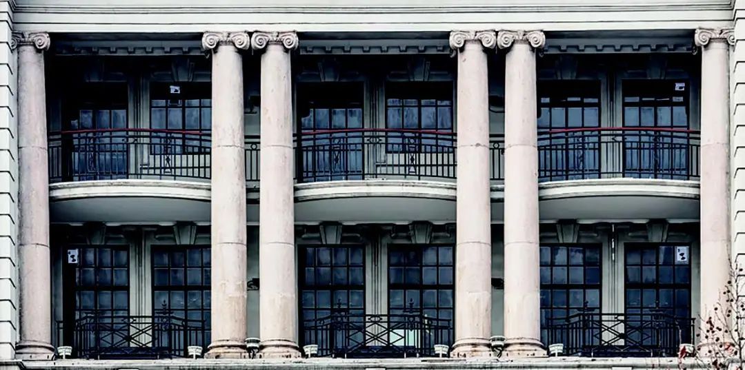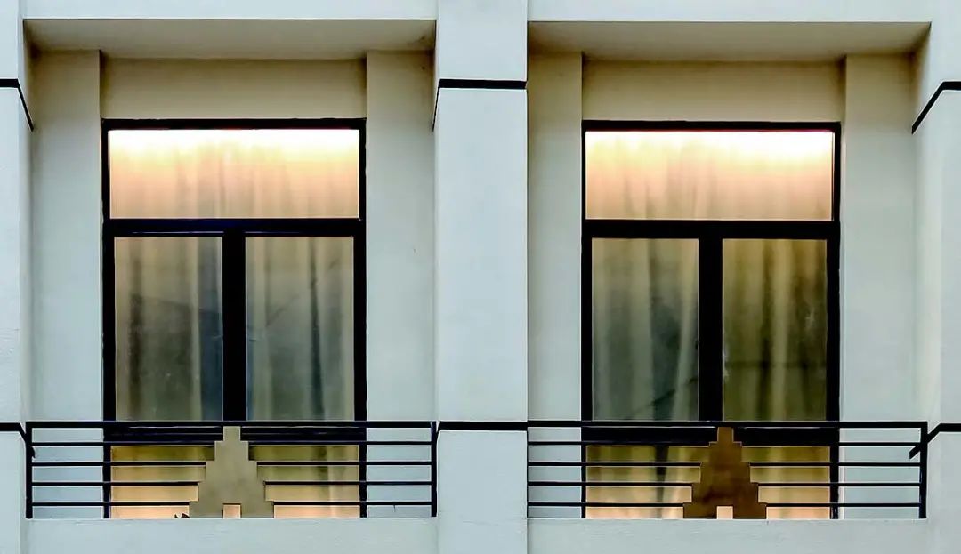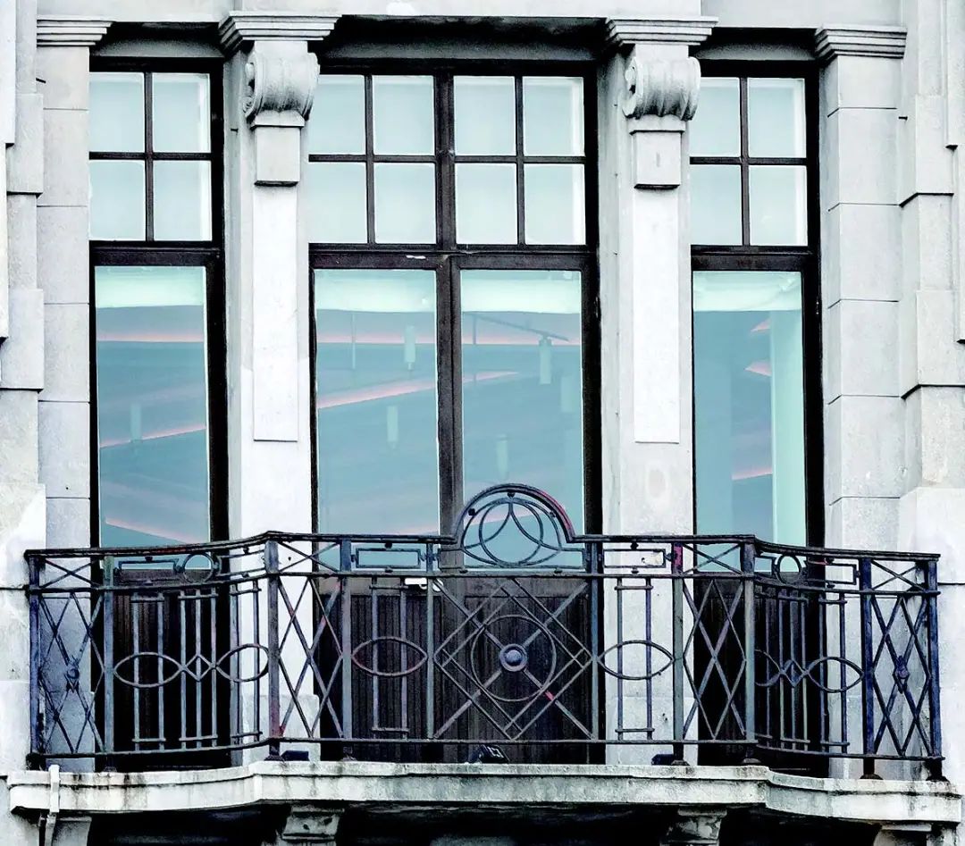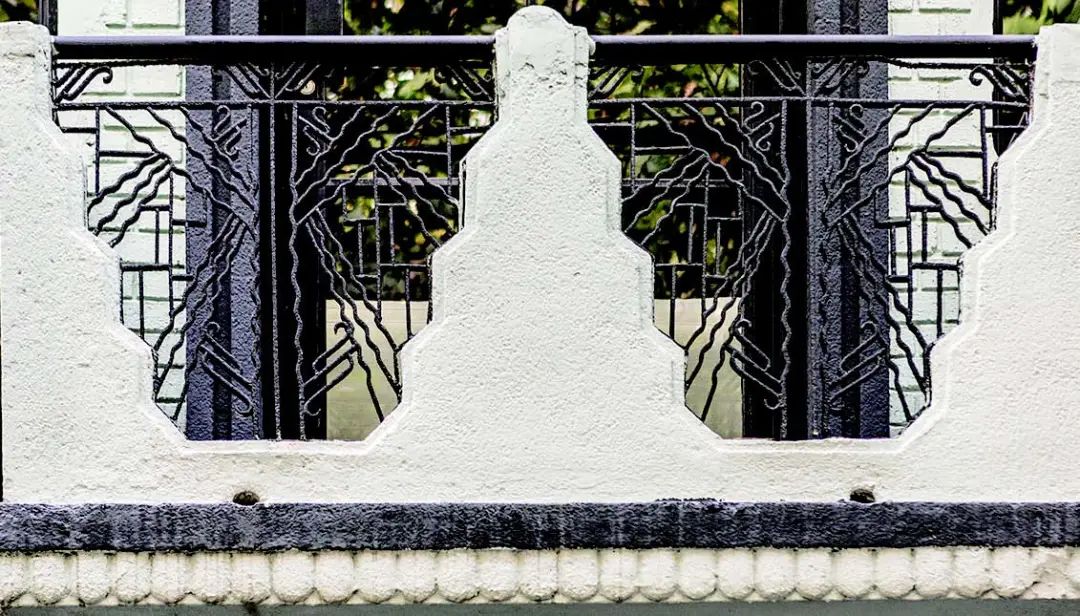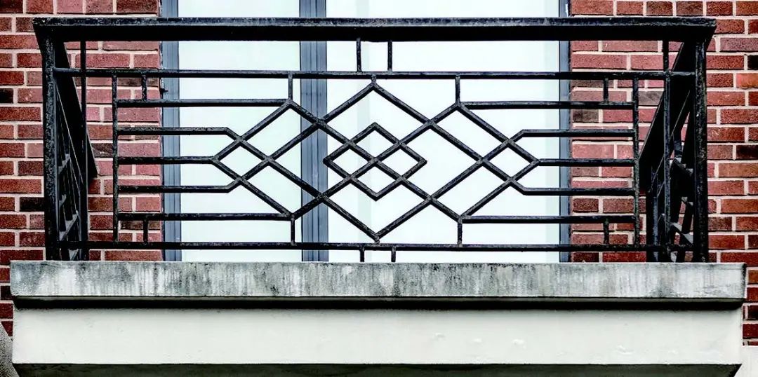 海派建筑装饰艺术主义风格阳台的栏杆大多为精致的格栅或水平带状蕴含装饰艺术细部的几何形式,材质为钢制或锻铁。直接悬挑阳台板的檐口线条简约明快。