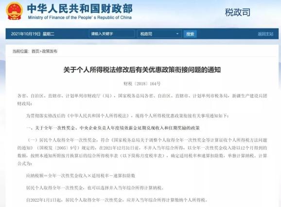 根据财政部、税务总局如下规定,居民个人取得全年一次性奖金,符合国家规定的,在2021年12月31日前,不并入当年综合所得,以全年一次性奖金收入除以12个月得到的数额,按照本通知所附按月换算后的综合所得税率表,确定适用税率和速算扣除数,单独计算纳税。