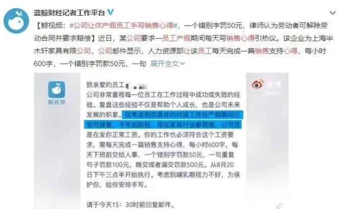 之前,一位孕妈休产假后,被要求每天手写销售心得。每小时600字,一个错别字罚50元。