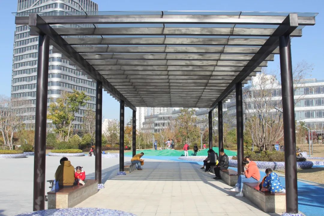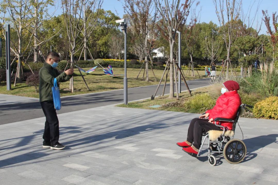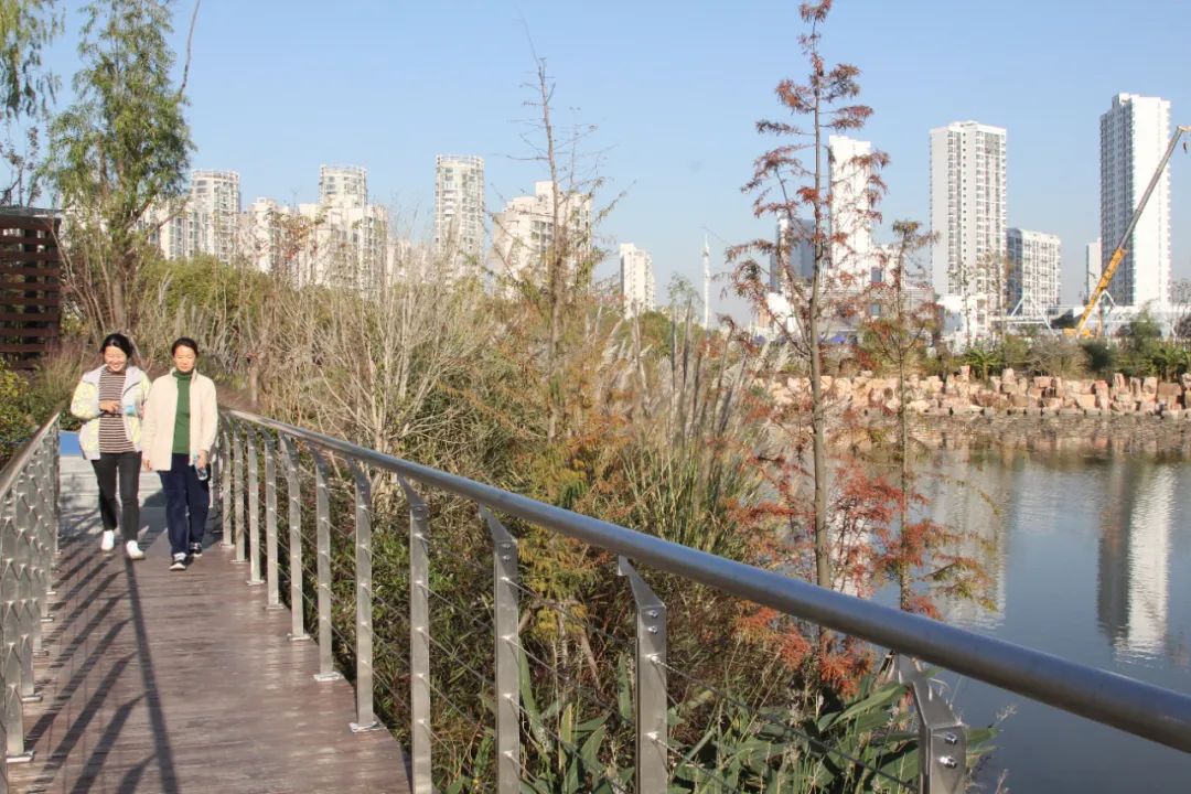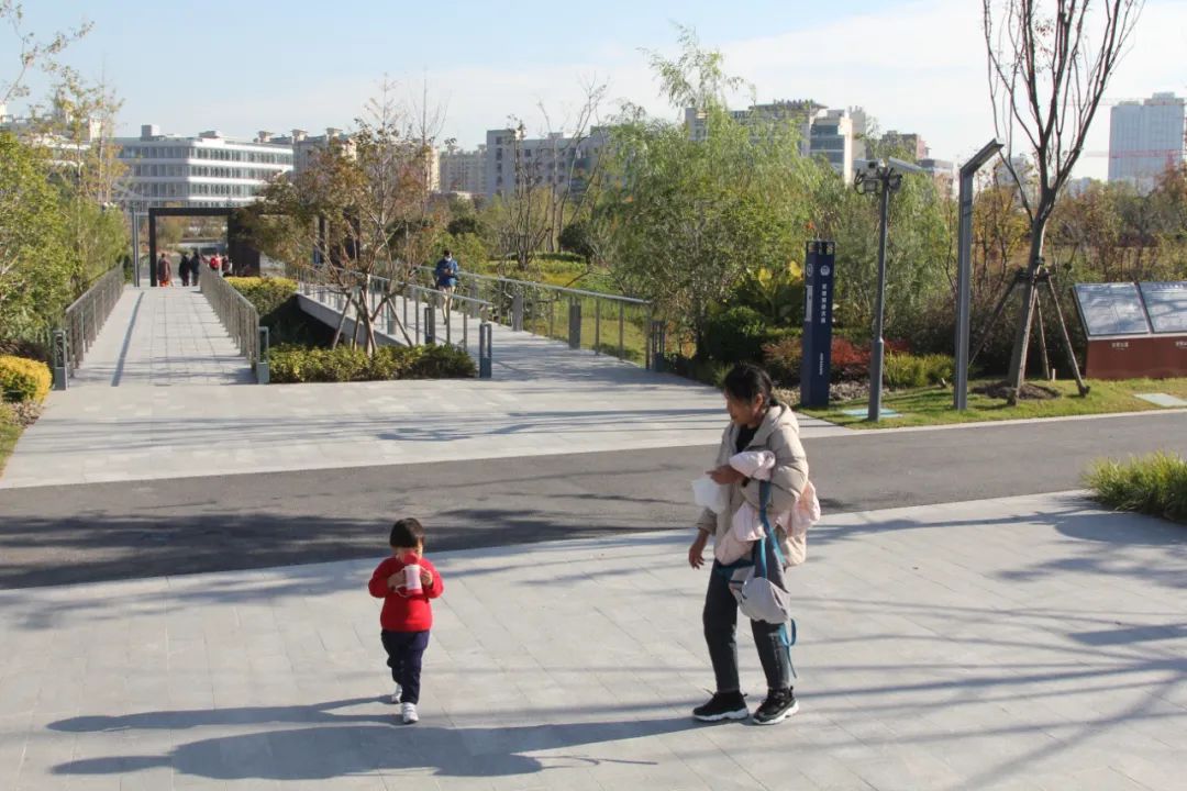 记者进去逛了一圈,园路、步道、亲水平台、广场等基础设施完备,在大门口还发现了无障碍通道,推轮椅者可自由出入;亭、榭、廊、阁等景观建筑、服务设施、主体工程及配套绿化、园林小品等配套设施,既简约现代,又有自然气息。