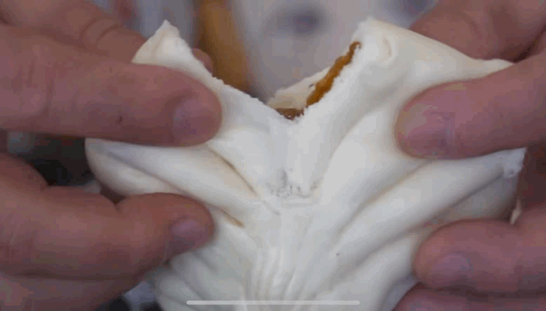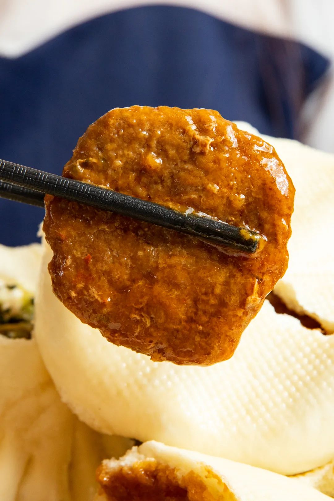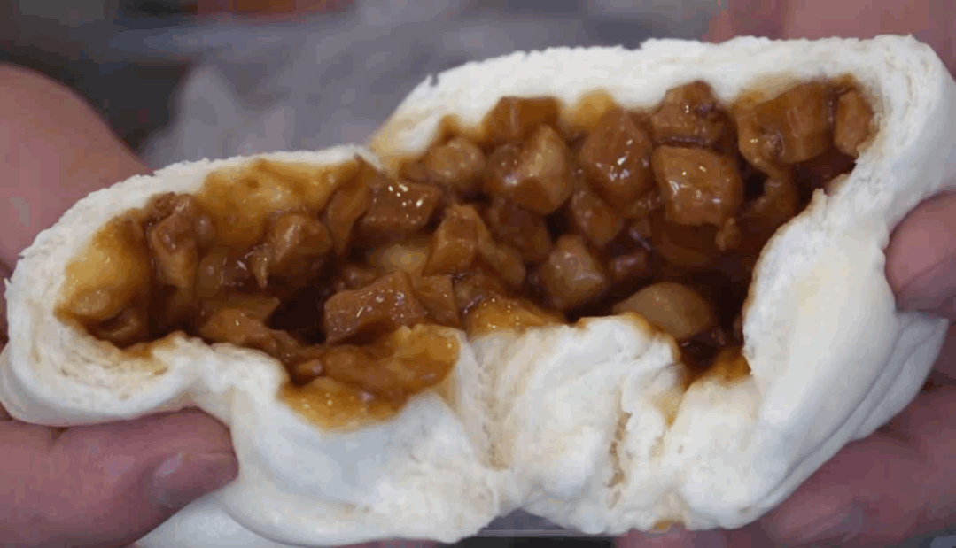 烧烤的操作也能搬运到包子上——烤肉包。纯牛肉馅的肉包,经过一烤,肉包已经被烤得金黄焦脆,里头的肉馅还带着黏糊糊的汁水。