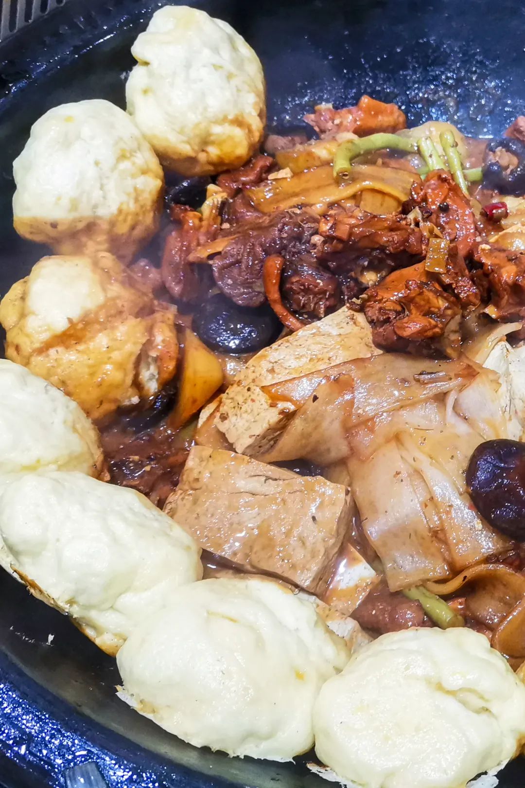 大黑铁锅将芸豆、土豆和排骨炖出了香气,排骨脱骨,土豆软烂,轮到包子出场。包子一个个码放在菜的上方,沁润着锅里的汤汁,“这包子得香几个跟头啊!”