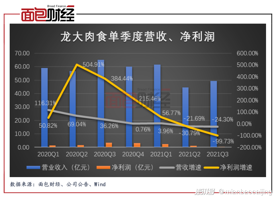图2:2020年以来龙大肉食单季度营收、净利润及同比增速
