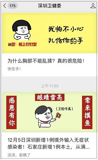 一直以来,“深圳卫健委”微信公众号风格明显,文章点击量很大,有不少“十万加”的爆款文章,算得上是政务类新媒体中很有特色和流量的账号。尤其是在防疫工作中,深圳市卫健委提出“我们一起打疫苗,一起苗苗苗苗苗”的口号,也风靡全国,给人留下了深刻印象。
