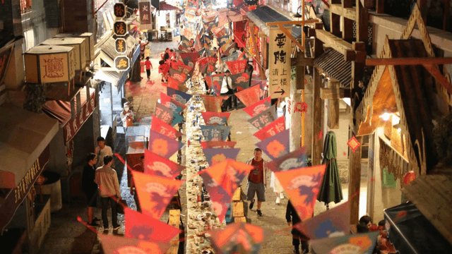 掌灯仪式:傍晚酉时,随着一声“酉时到,长夜至,掌灯,迎贵客!”店铺众掌柜行揖礼,同时街区灯笼如初醒的火龙般瞬间点亮,伴着音乐的渐起,灯光的光束向天空开合打亮整条街区。