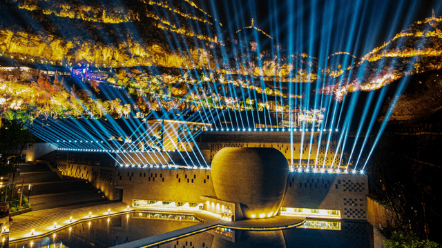 3D光影秀:以水、光、影、形、乐、演综合呈现齐鲁文化的魅力,3D动态投射于古风建筑之上,展示出磅礴大气、荡气回肠的国风气势。