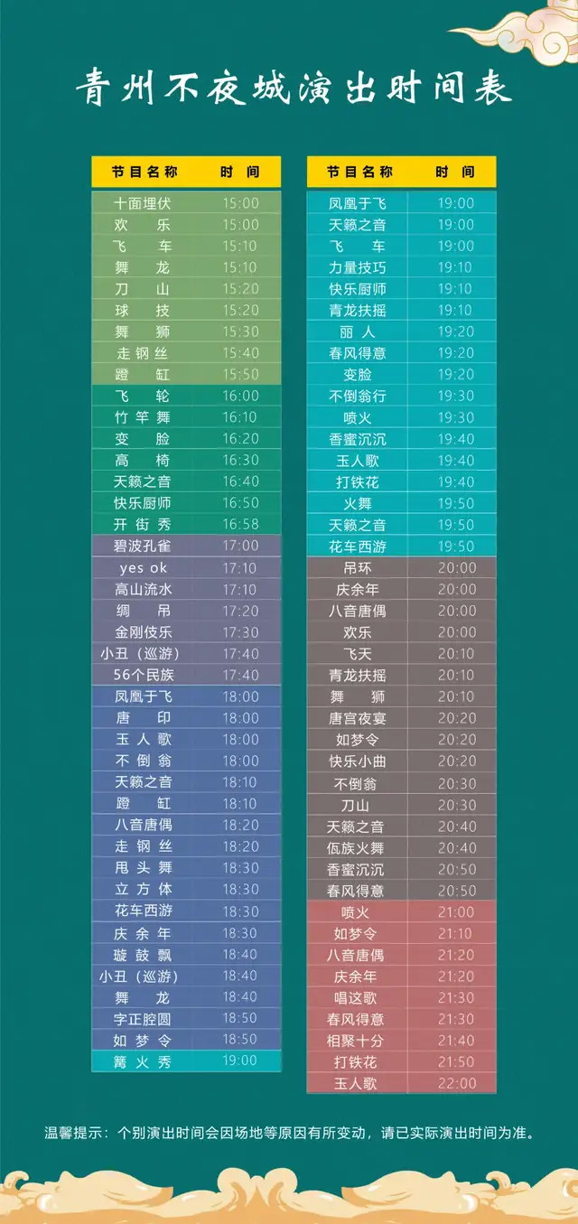 篝火晚会:青州不夜篝火晚会,热闹欢腾,载歌载舞,游客可以参与歌舞互动,同时有火把狂欢节,激情火舞、焰火杂技等表演。