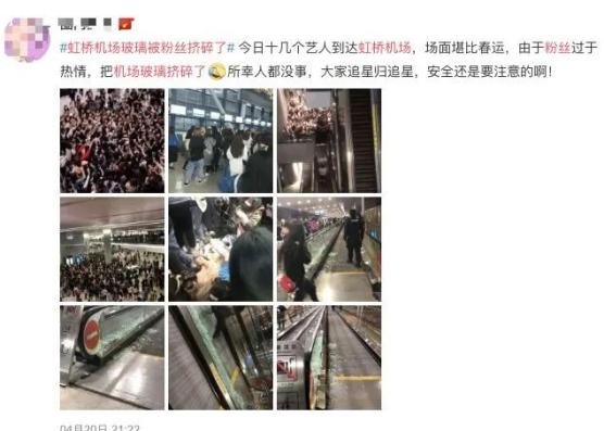 2019年4月,上海虹桥机场的玻璃直接被追星粉丝挤碎了。