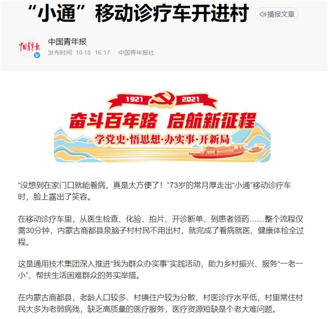 △中国青年报报道集团移动小通诊所“送医下乡”的事迹