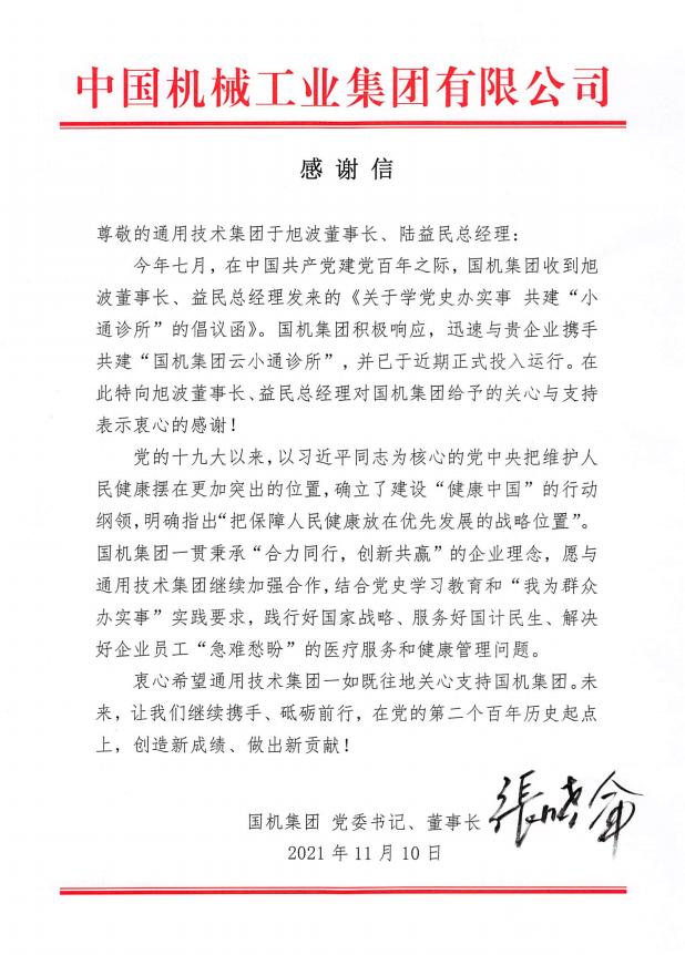 △国机集团党委书记、董事长张晓仑向集团主要领导发来感谢信,感谢通用技术集团在建设云小通诊所过程中给予的帮助和支持
