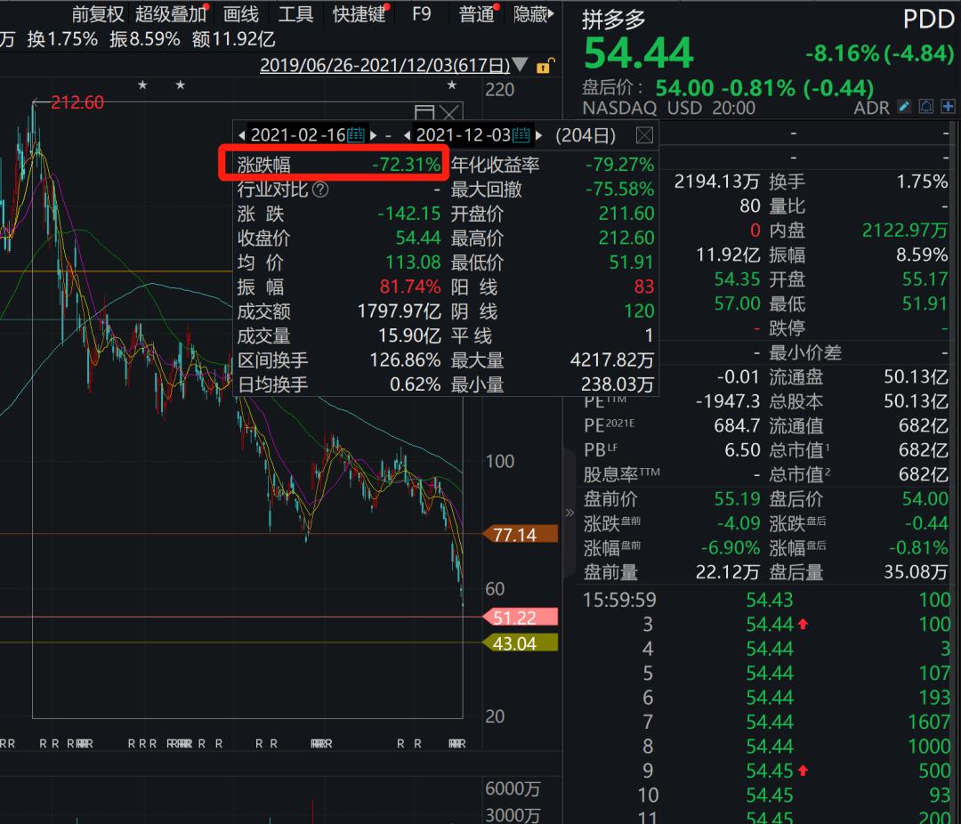 而从拼多多最新股价情况来看,年内从212的高点跌至最新的54美元左右,暴跌超72%,市值蒸发超1750亿美元(超1.1万亿元人民币)。