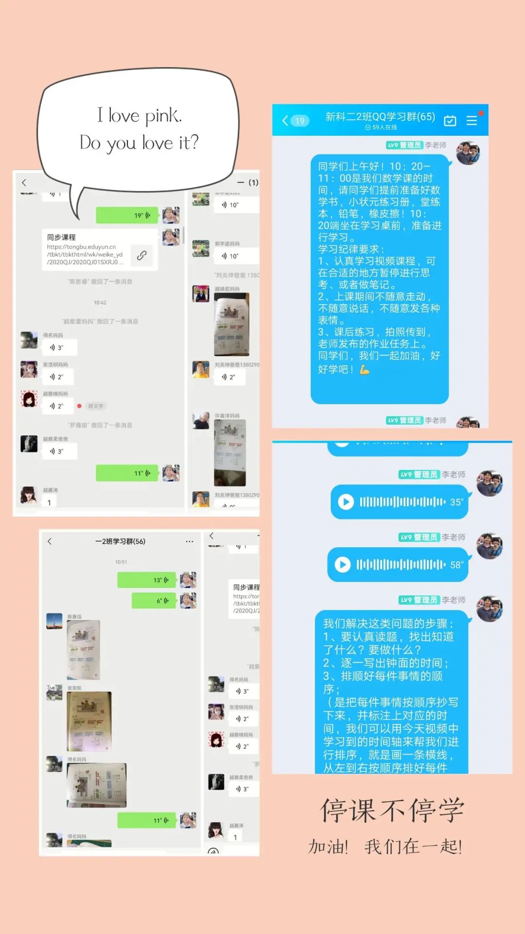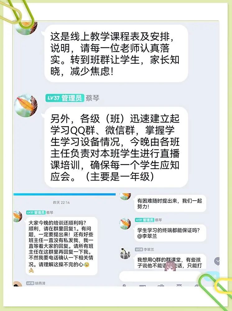 ➤ 学校提前做好了预案,各级(班)迅速建立起学习QQ群、微信群,掌握学生学习设备情况。各班主任提前对本班学生进行直播课培训,确保每一个学生应知应会。