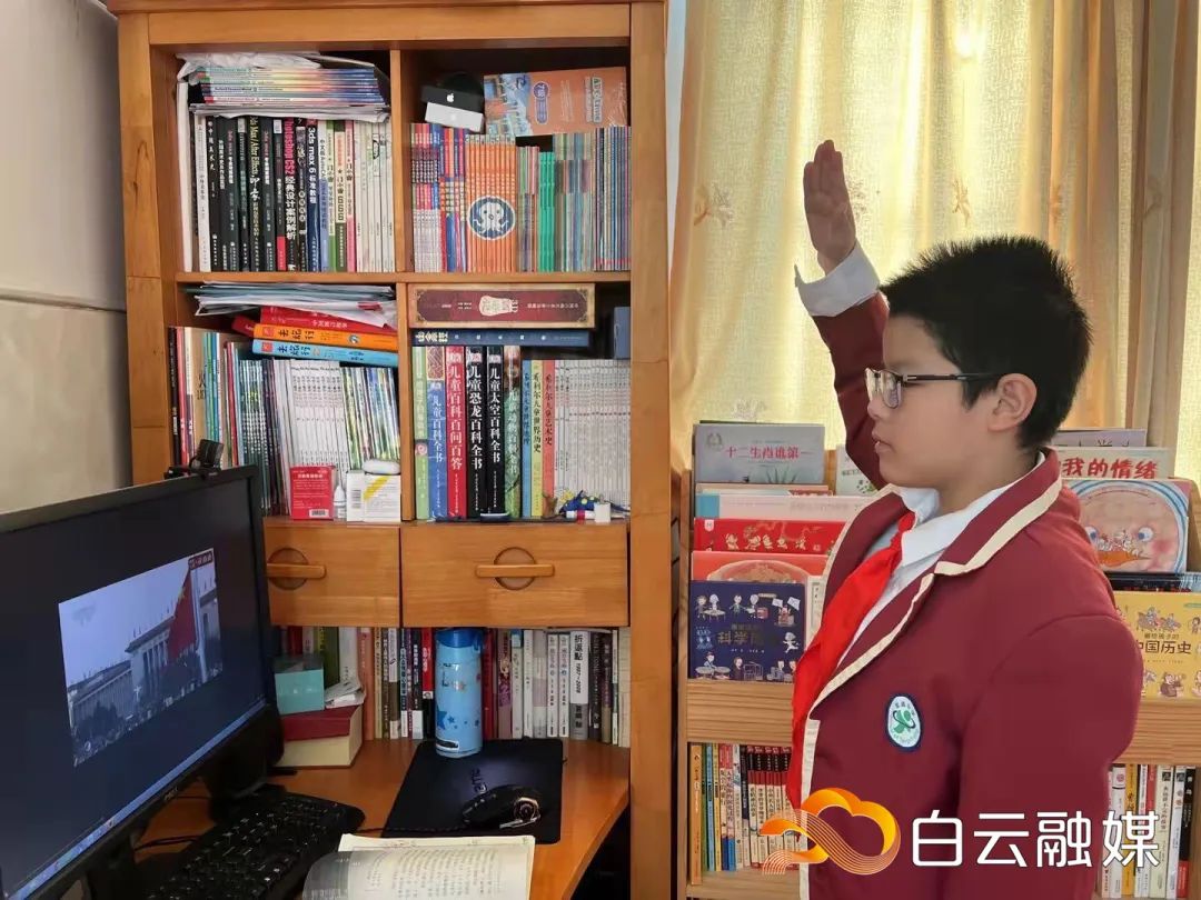 位于白云区新市街的棠涌小学,于12月6日上午开启居家线上教学。当天上午,学生在家中穿上礼仪服,敬队礼,参加了线上升旗仪式,培养爱国之情。