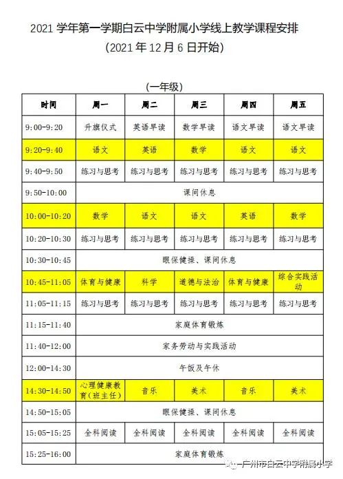 同样开启线上教学的,还有白云中学附属小学。自12月4日下午收到学校停课的通知后,该校立即启动线上教学预案,制定了线上教学方案和课程表。