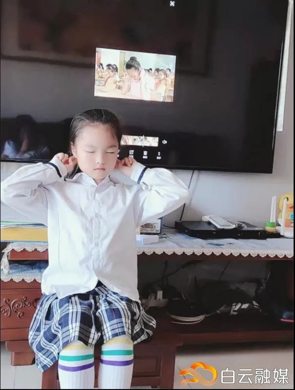 同学们在老师的在线指导下,做眼保健操,跳粤韵操,背诵古诗。该校体育老师还专门录制了动感啦啦操,带领同学们一起跳起来。