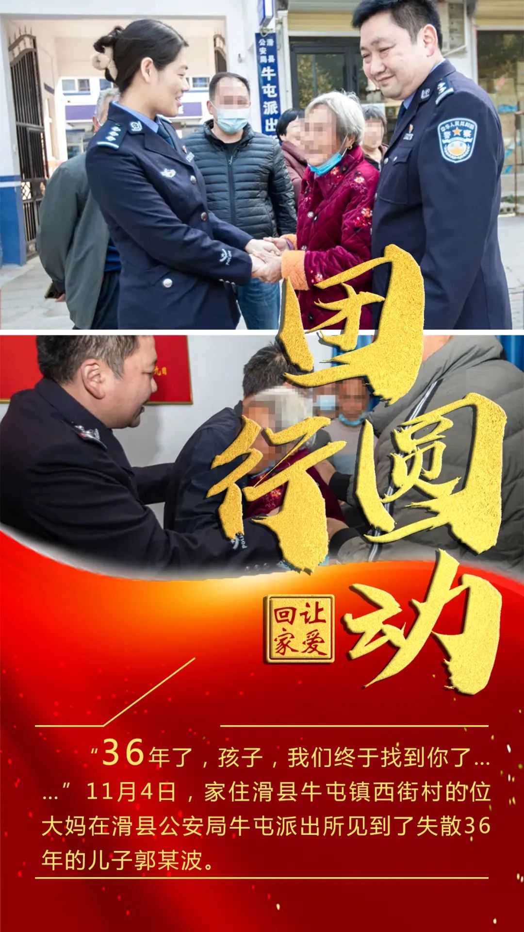 “36年了,孩子,我们终于找到你了……”11月4日,家住滑县牛屯镇西街村的位大妈在滑县公安局牛屯派出所见到了失散36年的儿子郭某波。这是滑县警方“团圆行动”助力寻亲工作中的又一幕感人场景。