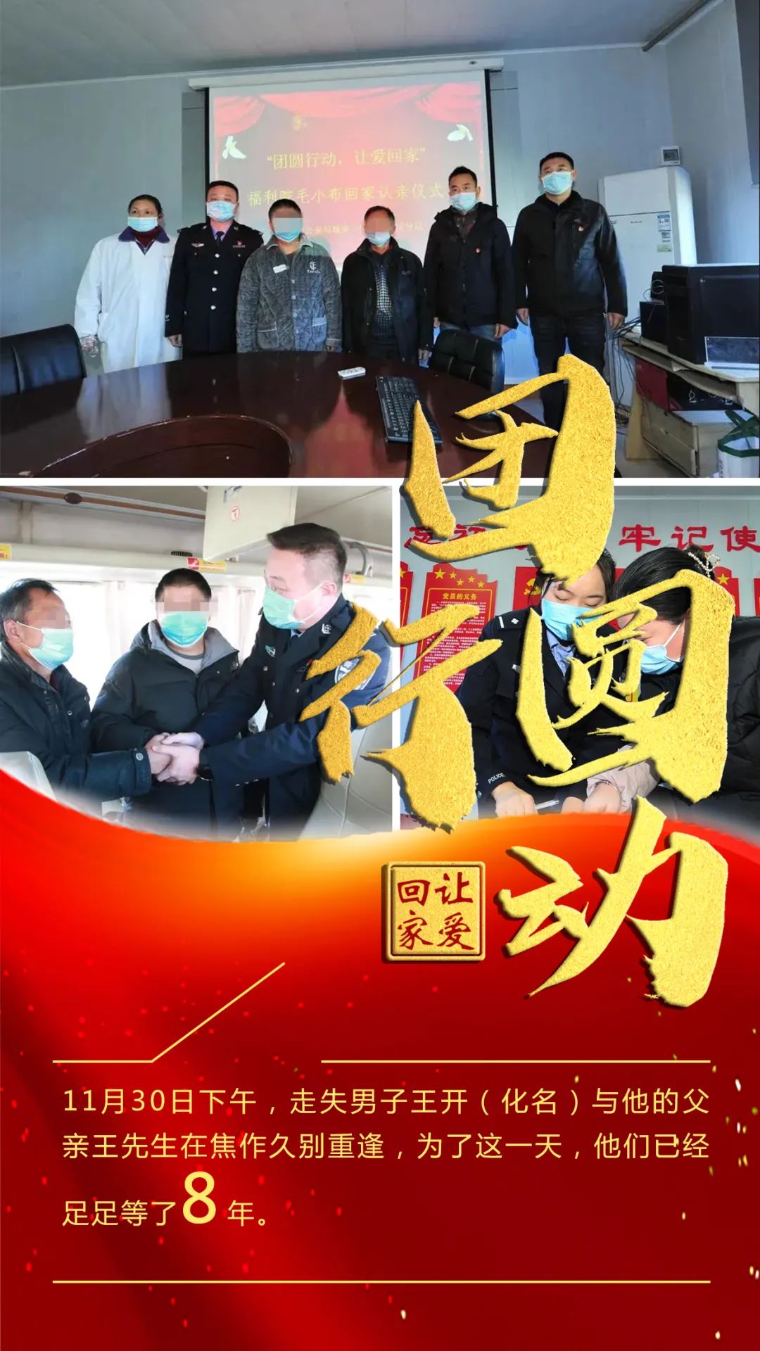 自公安部“团圆”行动开展以来,焦作市公安局城乡一体化示范区分局积极开展此项工作。今年11月4日焦作一男子王开与郑州王先生走失的儿子特征相符。示范区分局民警立即与当地公安机关取得联系,最终获得了王先生的联系方式,电话拨通的那刻,王先生激动地心情无以复加,他难以置信儿子会出现在近百公里之外的焦作市,这不远的距离竟让他找了八年。