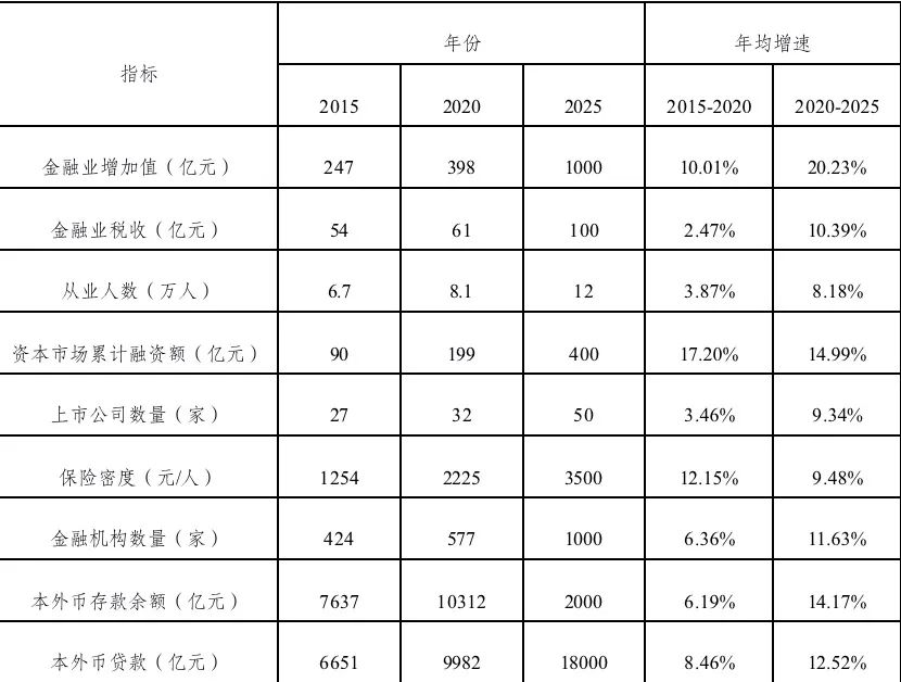 根据《规划》披露的数据显示,整个“十三五”期间,海南省金融业的发展较快。2015-2020年间,金融机构数量增加了36.08%,金融从业人数增加了20.90%,金融业增加值增长了61.09%,资本市场累计融资额增加了121.11%,保险密度增加了77.43%。在此基础上,为满足自贸港建设与发展需求,《规划》又对“十四五”期间金融业发展制定了具体的目标。具体如下表: