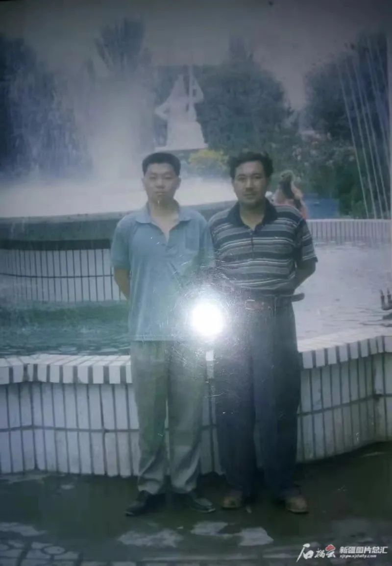 刘新民(左)第一次去莎车县城,塔西·热孜克(右)带他逛了逛当地的公园,还留下了这张合影。刘新民供图