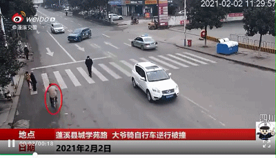 今年2月左右,四川遂宁,一名老人骑自行车在马路上逆向骑行,与一辆正常方向行驶的汽车迎面相撞,导致该名老人倒地受伤。根据案例监控视频,老人在车流中惊险逆行,最终还是没躲过危险……