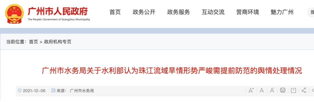 近日,因受到咸潮影响广州东部地区供水出现降压或停水情况。12月6日,广州市水务局在广州市政府网站发布了《关于水利部认为珠江流域旱情形势严峻需提前防范的舆情处理情况》,据气象、水文部门预测,今冬明春广州市降水量仍然偏少,咸潮上溯问题将更加严峻,但将通过各种措施全力确保居民生活用水。