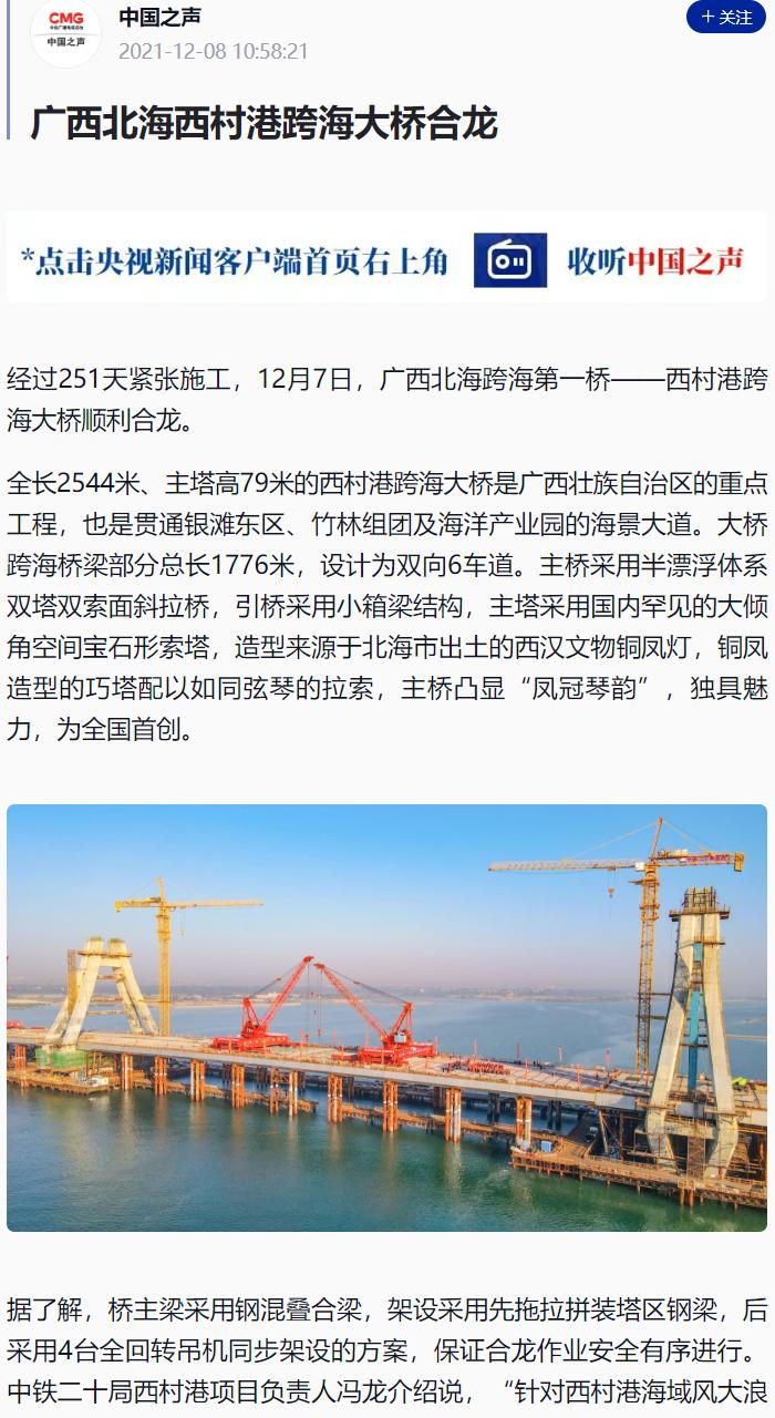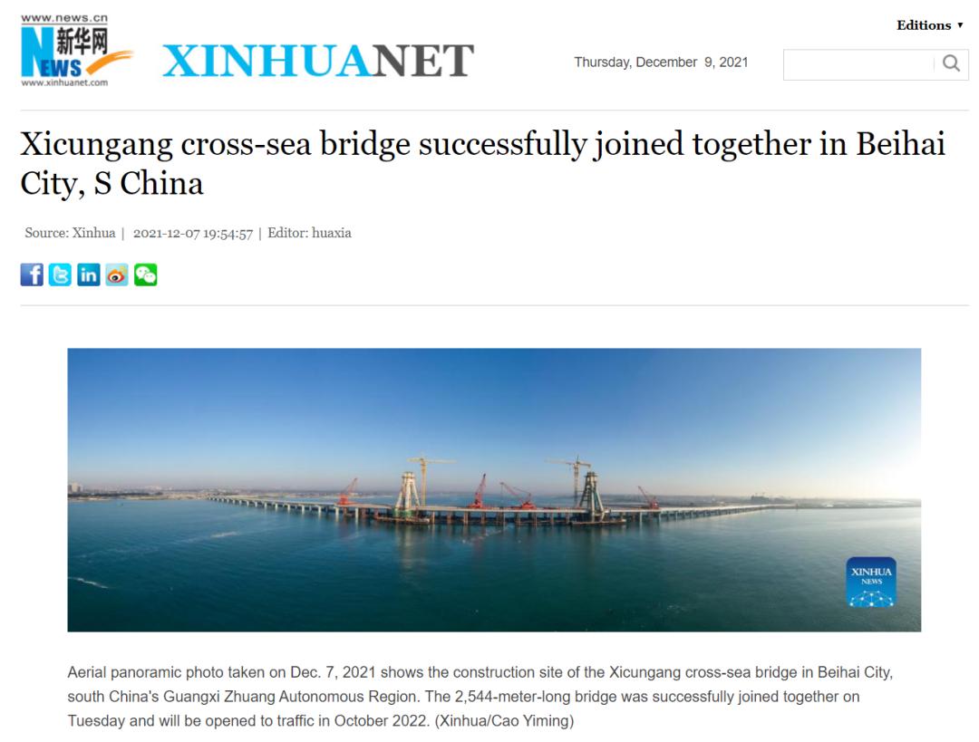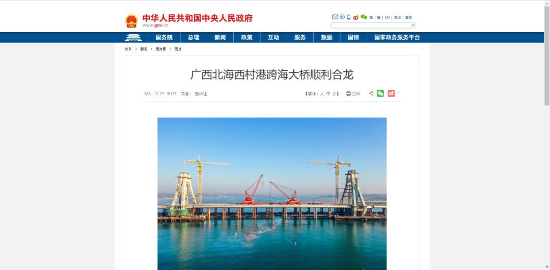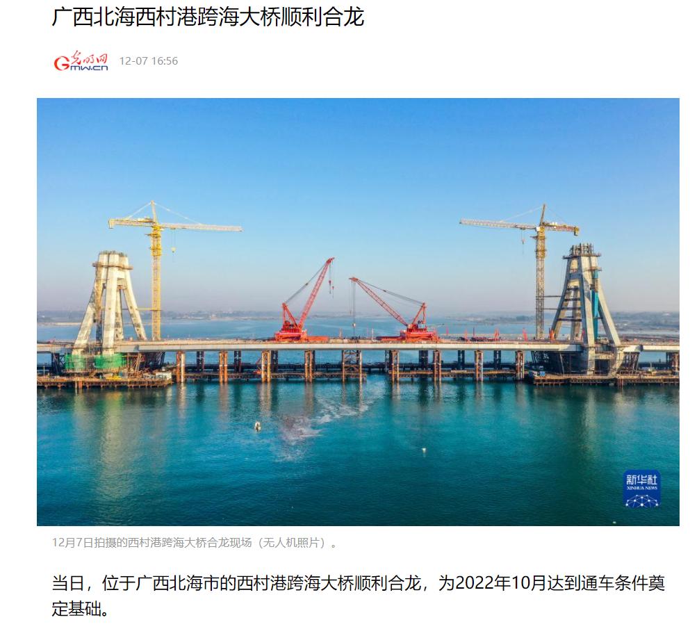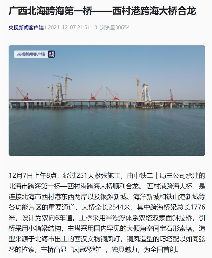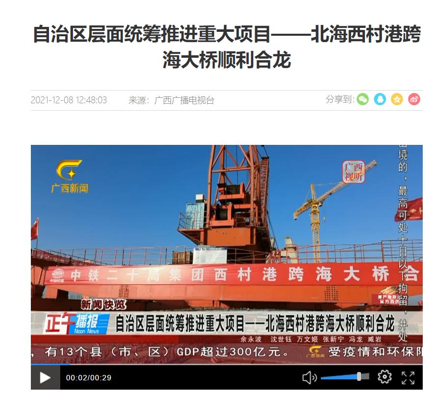 北海西村港跨海大桥成功合龙的喜讯,受到当地政府、社会各界的广泛好评,广大媒体也热切关注并第一时间进行了报道。