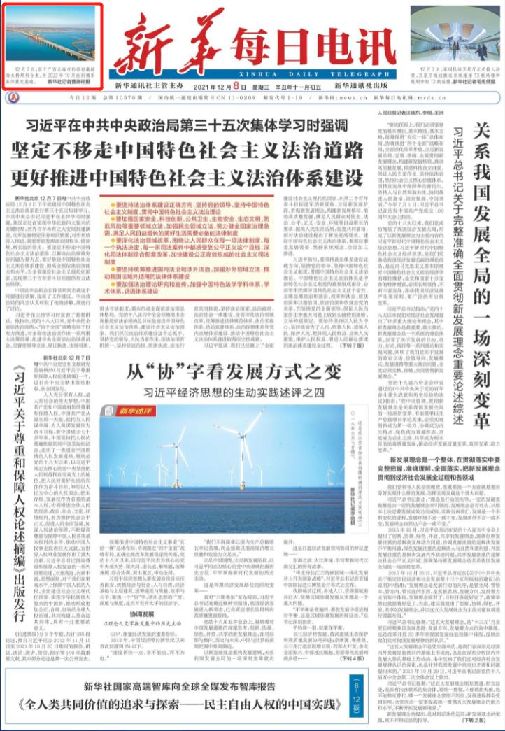 12月8日,《新华每日电讯》一版报眼位置展示中铁二十局西村港跨海大桥合龙新闻。