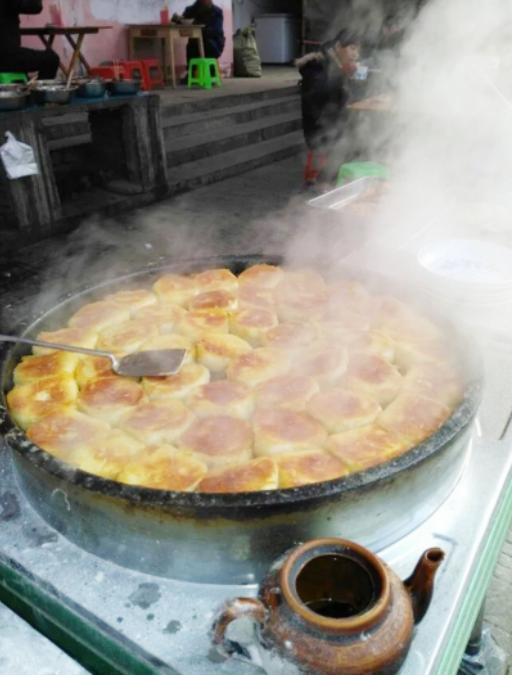 最后是最关键的环节,也就是煮包子。此环节要求火别太猛,但要稳,不能忽大忽小。待平底锅烧到六成热时,便用小刷子沾上菜籽油,均匀地在锅底上刷一层。这层油不能多也不能少,油多了加水时会溅油花,容易烧伤人,油少了又会使包子底粘结在锅底。待油有热气时,便将包子放进平底锅里煎,并盖上锅盖加热,煎到包子底金黄色时,便加入适量清水蒸煮,大约20分钟左右,一锅香气四溢的水煮包子便制作好了。