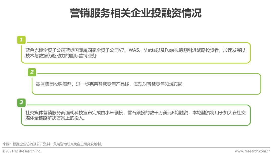 在头部平台活跃投资的营销科技板块,大数据与人工智能技术在营销领域的应用相对成熟,覆盖场景广泛,市场格局已初具规模,2021年1至11月期间,该细分赛道吸引了头部平台超过25笔股权投融资。通过大数据及人工智能技术,发挥数据价值驱动智能运营的作用,提升营销的精准度与智能化,带来业务持续增长,成为互联网平台的共识,因此各平台企业也积极投资相关业务,期待网络营销价值在相关技术的加持下,实现进一步突破。