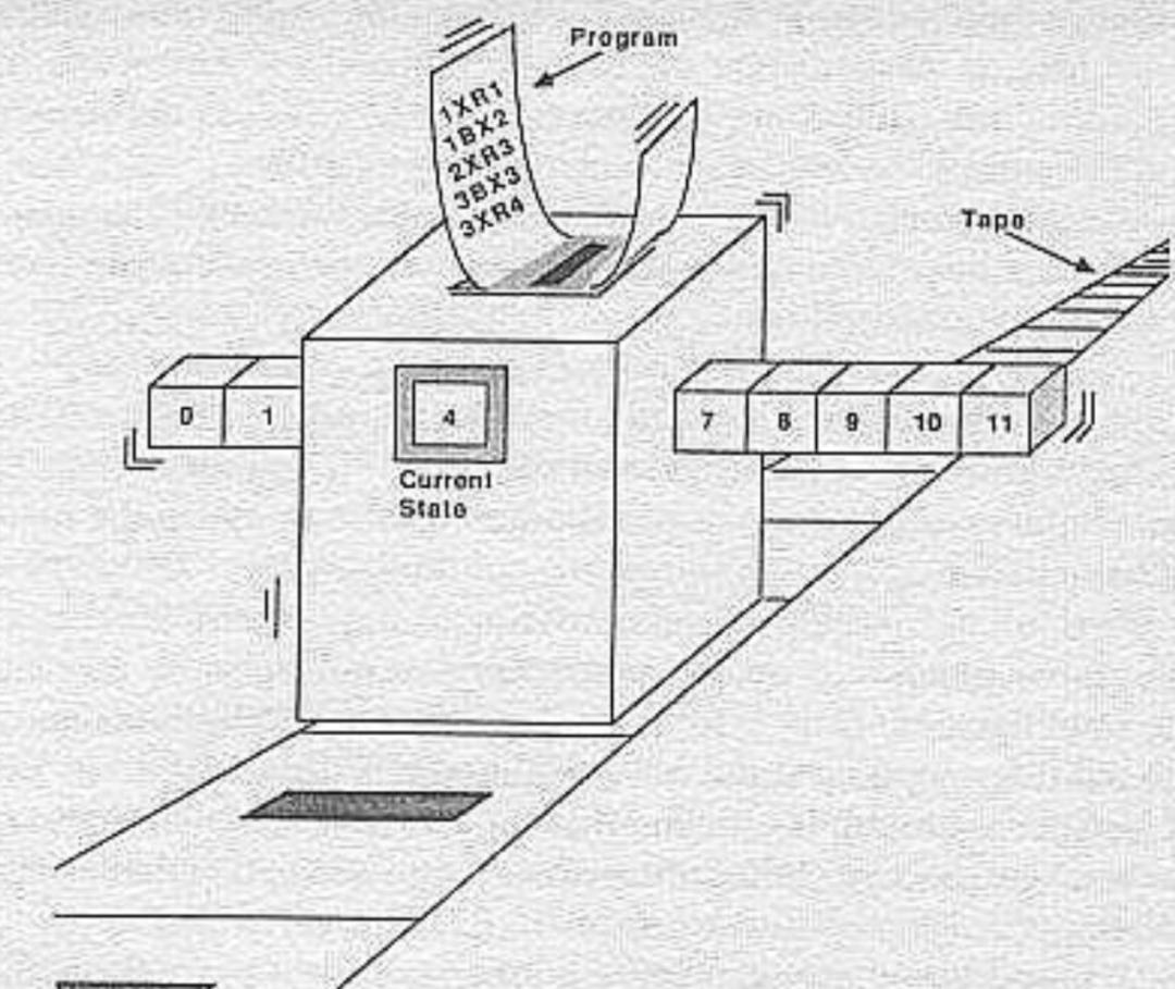 图灵机是一个虚拟的机器,它可以模拟计算机的任何算法。假设有一个长度无限的纸带,纸带上面的每个格子是空白的,但是可以读写数据,以此来模拟计算机内存。在纸带的上方有一个能够识别数据和做出反应的机器。机器只能写0和1,或者什么也不写。