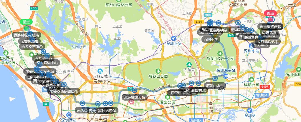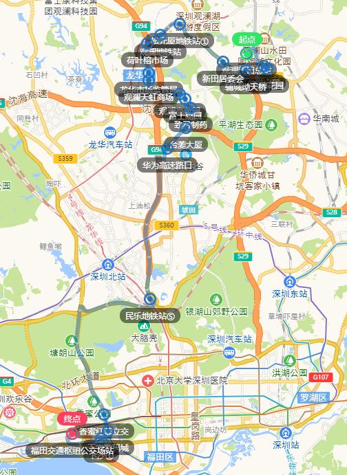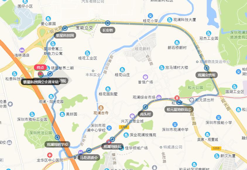 银星科技园公交首末站、电子科大深圳高研院、银星科技园、长安桥、观澜交管所、松元厦地铁站①、岗头村、观澜地铁站、马坜居委会、观澜锦明学校、银星科技园公交首末站