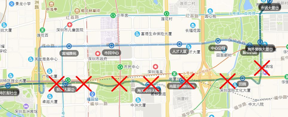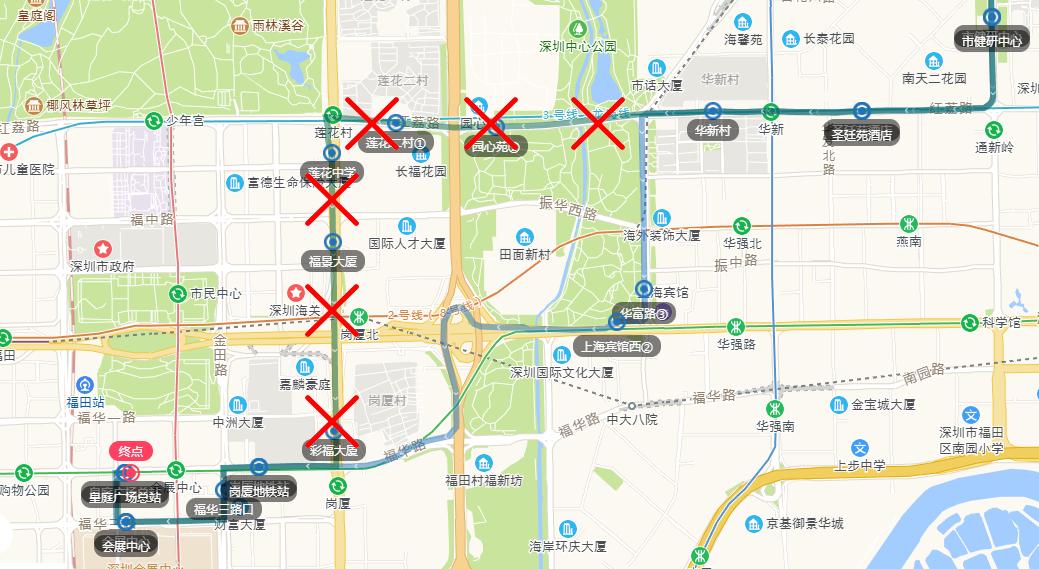 取消站点:双方向取消“海关综合大楼、田面”等2对公交停靠站,往东昌总站方向取消“投资大厦②、岗厦北地铁站②”等2个单边公交停靠站,往福田交通枢纽公交场站方向取消“广电大厦①、岗厦北地铁站①”等2个单边公交停靠站。