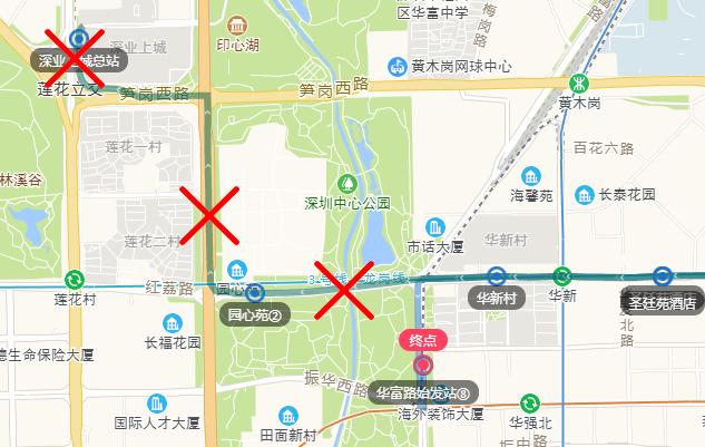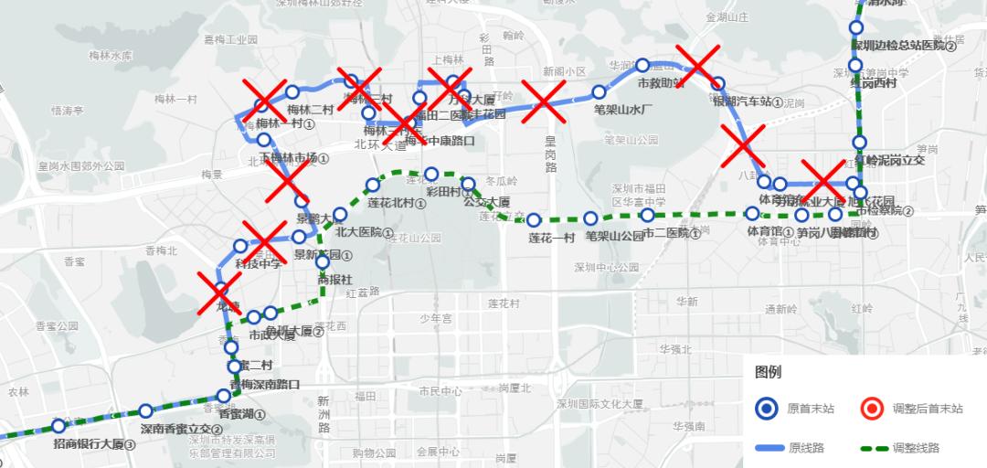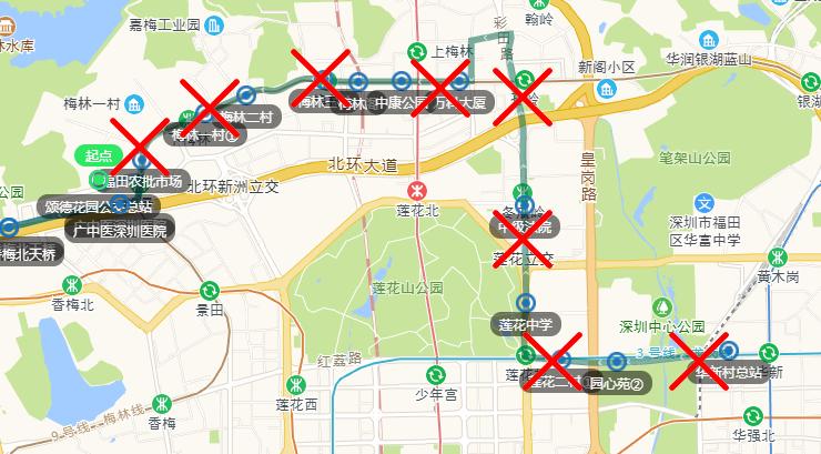 取消站点:双方向取消“梅林二村、梅林三村、梅林阁、中康公园、万科大厦、中级法院、莲花二村①、园心苑②”等8对公交停靠站。