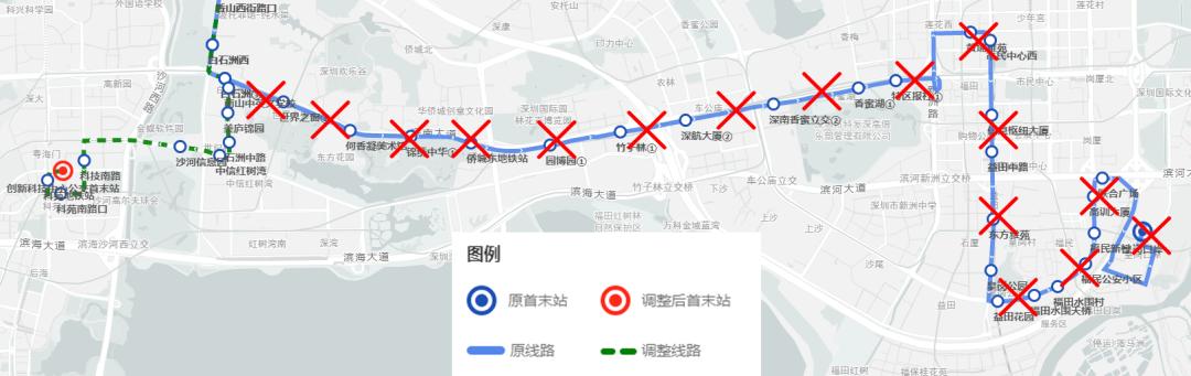 取消站点:双方向取消“世界之窗①、锦绣中华①、侨城东地铁站、园博园①、竹子林①、深航大厦②、深南香蜜立交②、香蜜湖①、特区报社①、黄埔雅苑、市民广场西、信息枢纽大厦、益田中路、东方雅苑、皇岗公园、益田花园、福田水围天桥、福田水围村、福民公安小区、福民新村、高训大厦、联合广场”等22对公交停靠站,往创新科技中心公交首末站方向取消“西丽南路、西丽市场、何香凝美术馆”等3个单边公交停靠站,往中山园北总站方向取消“广电大厦临时站、何香凝美术馆②、白石洲③”等3个单边公交停靠站。