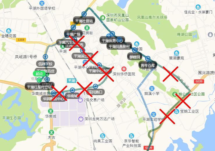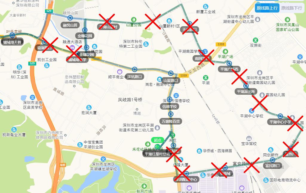 取消站点:双方向取消“任屋村、华润配送中心、华南城、富民路口、平湖中心小学、平湖派出所、平湖广场西、园心苑②”等8对公交停靠站,往平湖任屋村总站方向取消“富伟厂”1个单边公交停靠站。